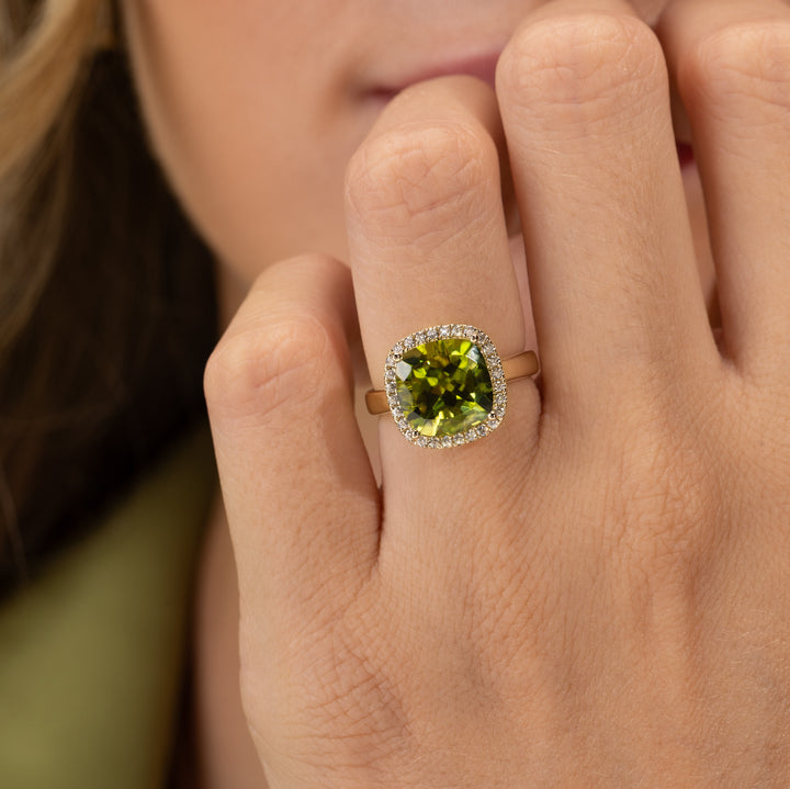 Nova diamond set earrings attachments set with a cushion shaped Peridot