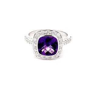 This expert-crafted dress ring showcases a cushion-shaped amethyst nestled within a secure rub-over setting, framed by a radiant halo of round brilliant cut diamonds. The diamond-set shoulders enhance its refined halo cluster design, offering a sophisticated blend of colour and sparkle set in 9ct white gold. Ideal for adding a touch of elegance to any outfit.