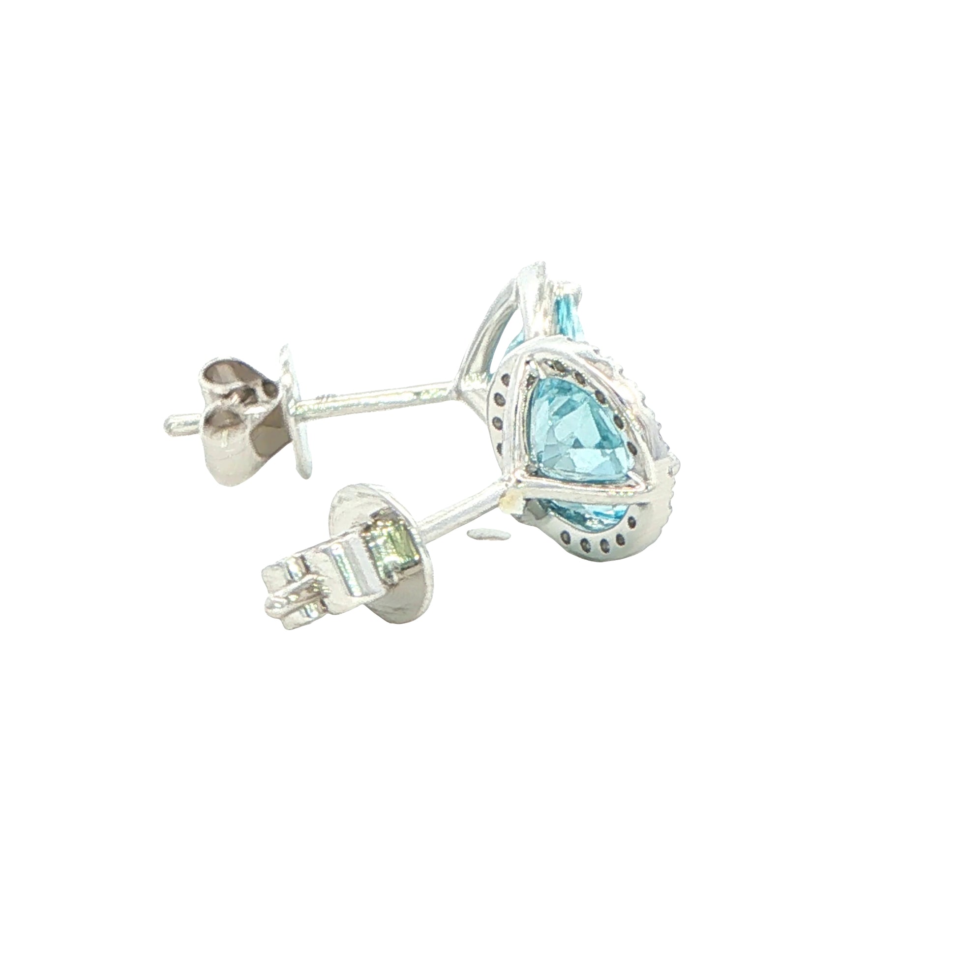 These 9ct white gold earrings feature two Aquamarine gemstones, set in a 4 claw setting and surrounded by a halo of round brilliant cut diamonds. The elegant design creates a classic and timeless look, perfect for any occasion.