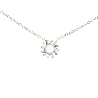 This elegant 18ct white gold pendant captures the radiance of the sun with its distinctive circular design. Featuring 0.24 carats of precisely cut baguette diamonds arranged in a sophisticated pattern, the piece combines contemporary geometry with timeless luxury. The diamonds are expertly set to maximise light reflection, creating a luminous focal point. Suspended from an 18-inch fully adjustable chain, this pendant offers versatile styling for both everyday wear and special occasions. A refined addition to any jewellery collection.
