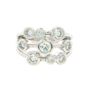 This exquisite platinum ring features a unique bubble style design, artfully set with nine round brilliant cut diamonds totalling approximately 1.10 carats. The diamonds are arranged over three elegant strands in a secure rub-over setting, offering exceptional sparkle and durability. Perfect for those seeking refined craftsmanship and timeless sophistication.