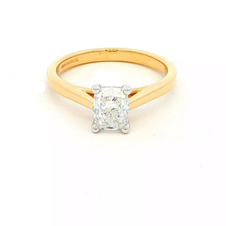 This elegant solitaire ring features a 0.90 carat elongated cushion-shaped diamond, expertly set in a secure 4-claw platinum setting that enhances brilliance and durability. Crafted in 18ct yellow gold, its classic design is refined yet versatile, making it perfectly compatible with wedding bands for a seamless, sophisticated look. Ideal for those seeking timeless elegance combined with quality craftsmanship.