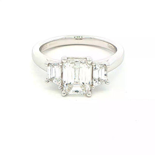 This expert-crafted 3-stone ring features a stunning 1.50ct emerald-cut diamond set in a secure 4-claw setting, flanked by step-cut trapezoid diamonds to enhance its refined elegance. Crafted from platinum, this 2.00ct total weight ring combines classic sophistication with modern precision, making it an ideal choice for pairing with a wedding band. Its balanced design and premium materials ensure enduring beauty and versatility for any occasion.