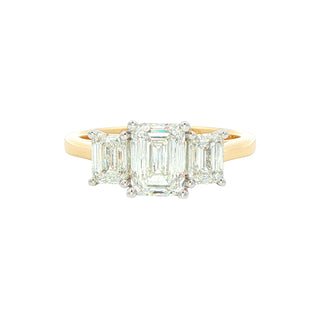 This stunning three-stone engagement ring showcases a magnificent 1.20-carat emerald-cut diamond as its centrepiece, flanked by two matching emerald-cut diamonds for a total carat weight of 2.03 carats. The principal stone is expertly set in a secure four-claw platinum setting, which provides exceptional durability and a sophisticated contrast to the warm lustre of the 18-carat yellow gold band. The symmetrical side stones enhance the geometric elegance of the emerald cut, creating a refined, balanced design. This configuration is particularly wedding band-friendly, allowing for seamless pairing with complementary bands.