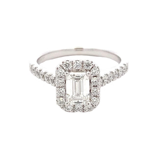 Elevate your style with our platinum halo cluster ring featuring a 0.72ct emerald cut diamond in a 4 claw setting. Surrounded by a halo of round brilliant cut diamonds, with additional diamond set shoulders, for a total weight of 1.16cts. Perfect for a wedding band pairing.