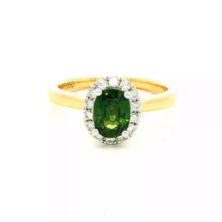 This exquisite ring features a vibrant green sapphire set in a platinum setting, surrounded by a halo of round brilliant cut diamonds. The band is crafted from 18ct yellow gold, combining classic warmth with contemporary elegance. Designed for those with a discerning eye, this piece offers a striking contrast and exceptional brilliance, making it a sophisticated choice for any occasion.