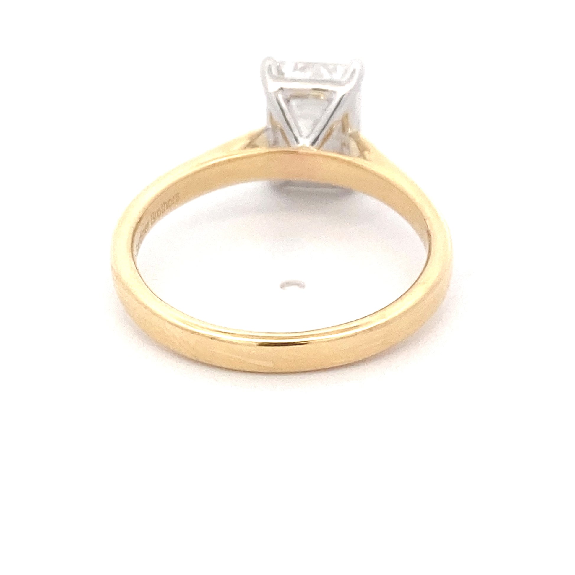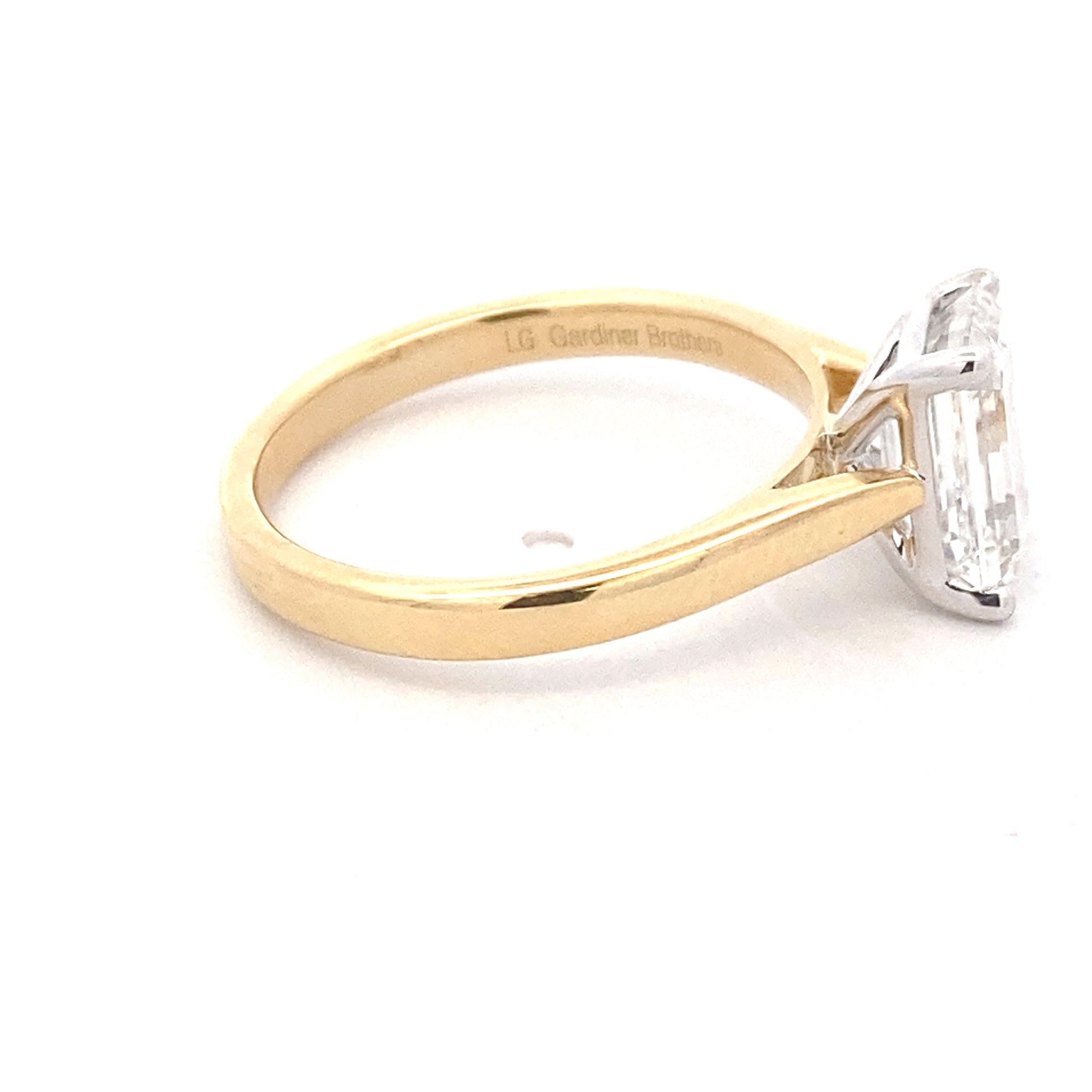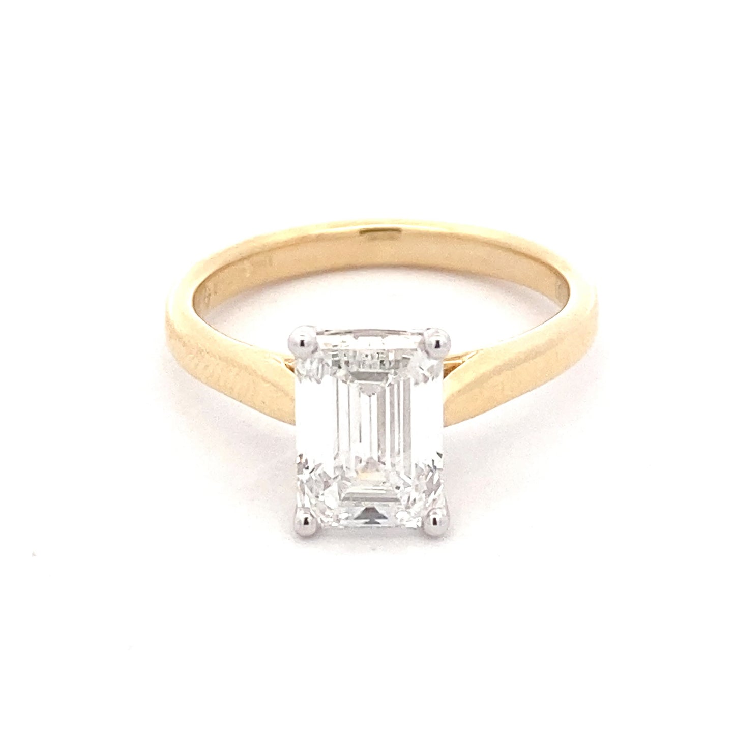 Introducing our stunning 2.01ct lab grown emerald cut diamond solitaire ring, set in a 4 claw platinum setting. Made with environmentally-friendly 18ct yellow gold, this ring is not only beautiful but also perfect for those looking for a wedding band friendly design. Expertly crafted for a timeless and elegant look.