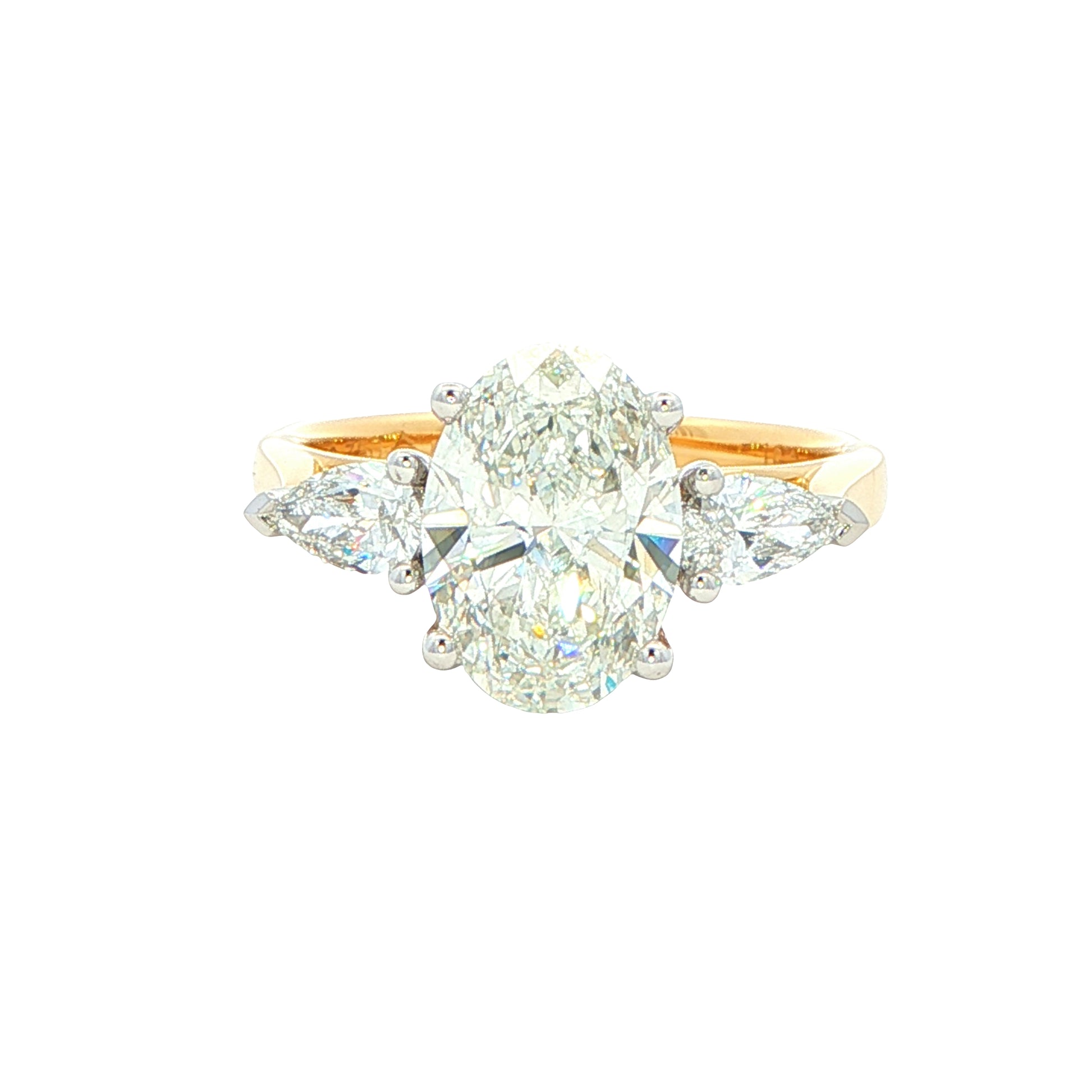 This elegant three-stone engagement ring showcases a stunning 2.02ct oval lab-grown diamond as its centrepiece, secured in a sophisticated platinum four-claw setting that maximises light performance. Flanked by two pear-shaped diamonds, the design creates a striking focal point whilst maintaining refined proportions. Crafted from 18ct yellow gold, the band offers warmth and durability, complementing the brilliant white of the platinum setting. This versatile design pairs beautifully with wedding bands, making it an ideal choice for those seeking a distinctive yet harmonious bridal set.