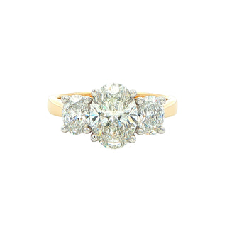 This elegant three-stone ring showcases a stunning 1.55-carat lab-grown oval diamond as its centrepiece, flanked by two smaller matching oval diamonds for a classic, sophisticated look. The main stone is set in a secure four-claw platinum setting, which provides exceptional durability and a lustrous white finish that beautifully complements the diamonds. The band is crafted from 18-carat yellow gold, offering warmth and timeless appeal whilst remaining wedding band-friendly for seamless stacking. With a total diamond weight of 2.37 carats, this ring delivers impressive presence and sparkle.