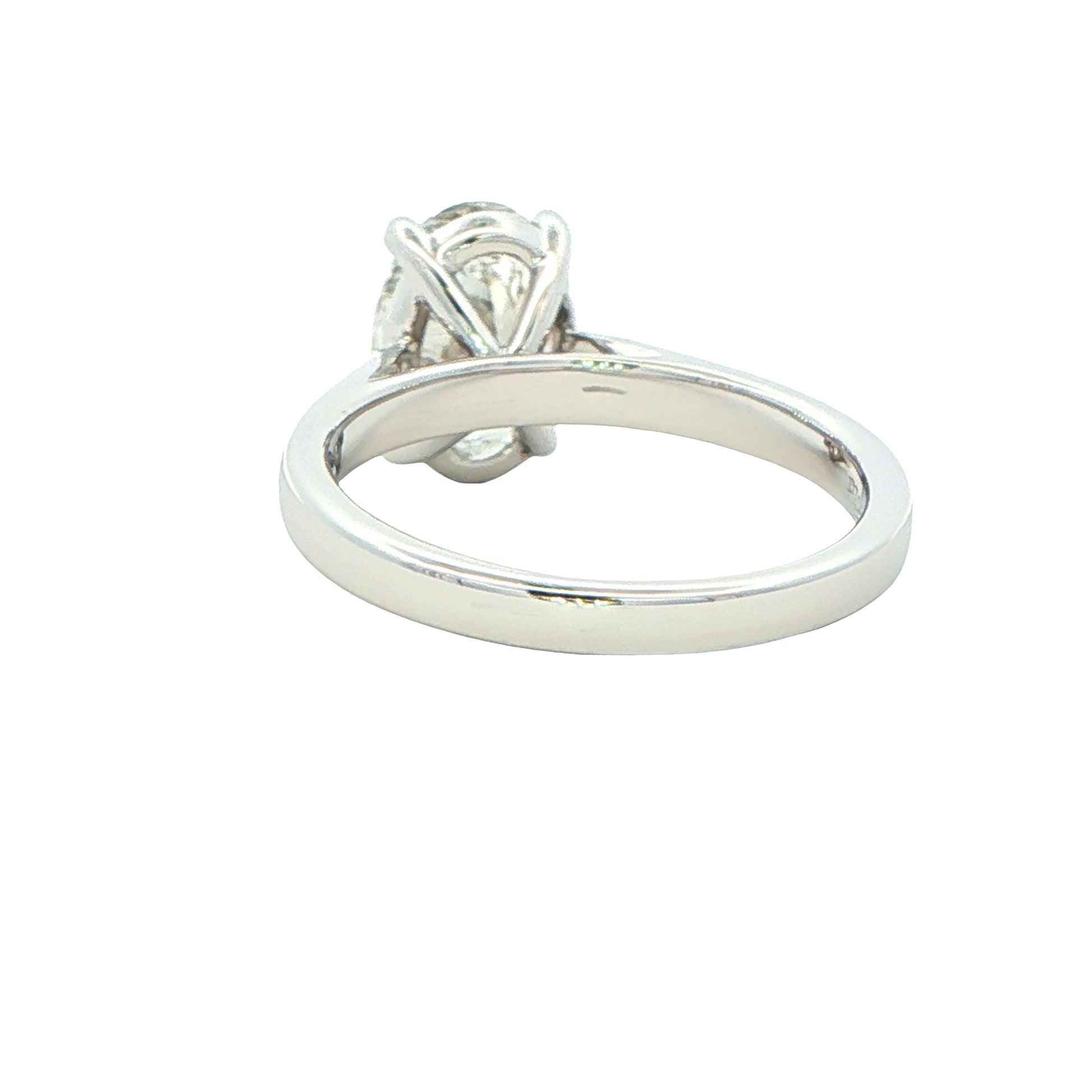 This platinum solitaire ring features a stunning 2.02ct lab grown oval shaped diamond, expertly set in a 4 claw setting. Its sleek design is wedding band friendly, making it the perfect option for a timeless and elegant engagement ring. Trust in the precision and quality of lab grown diamonds.