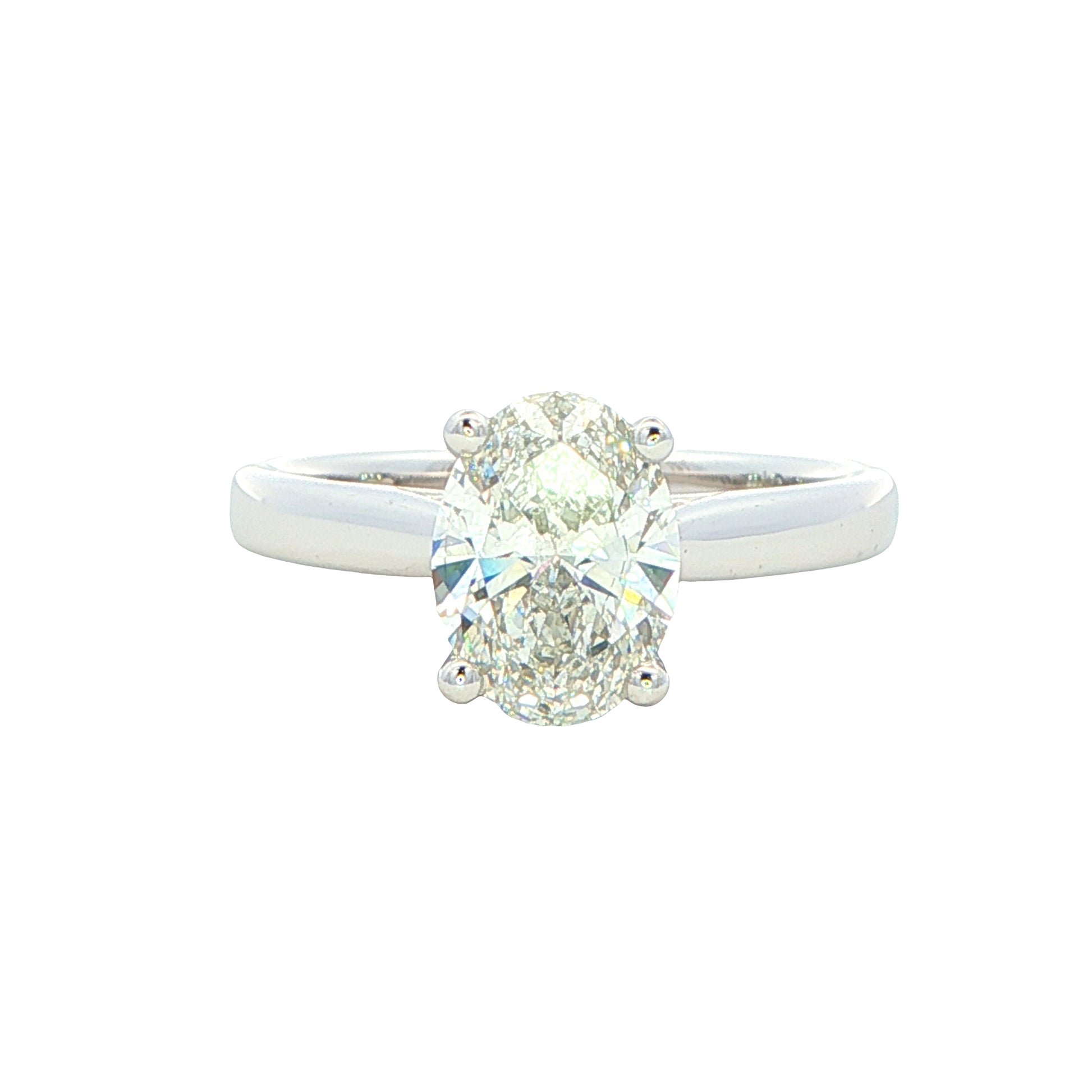 Discover timeless elegance with this platinum solitaire ring, featuring a stunning 1.51ct lab-grown oval diamond in a secure four-claw setting. The hidden halo of round brilliant diamonds adds subtle sparkle and sophistication without overwhelming the centre stone. With a total weight of 1.58cts, this design offers exceptional brilliance and fire. Lab-grown diamonds provide the same optical and physical properties as mined diamonds whilst offering excellent value. The elegant profile makes this ring perfectly compatible with wedding bands, allowing you to create a coordinated bridal set.
