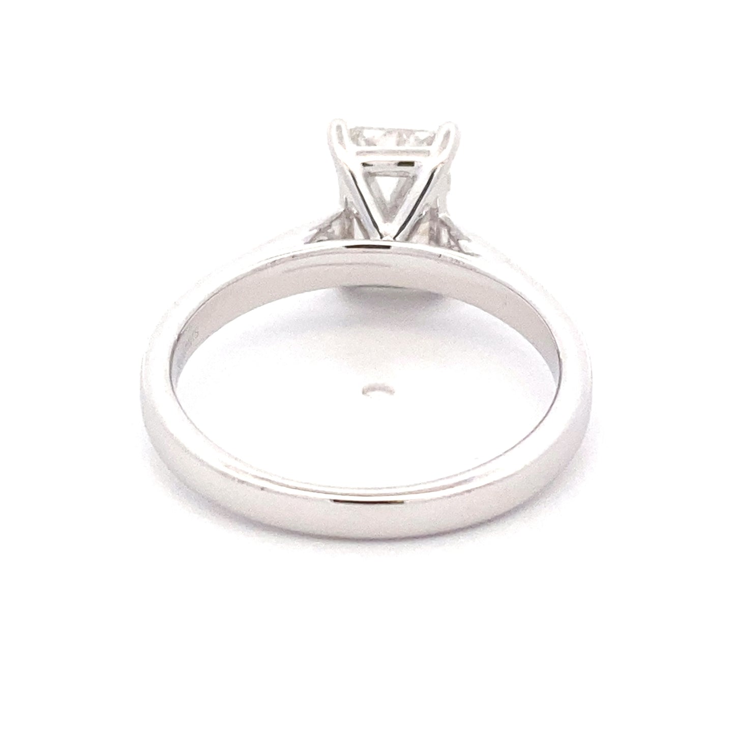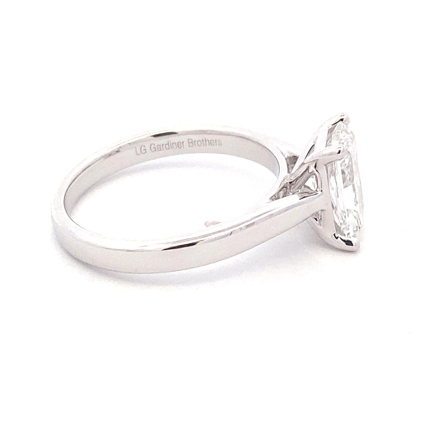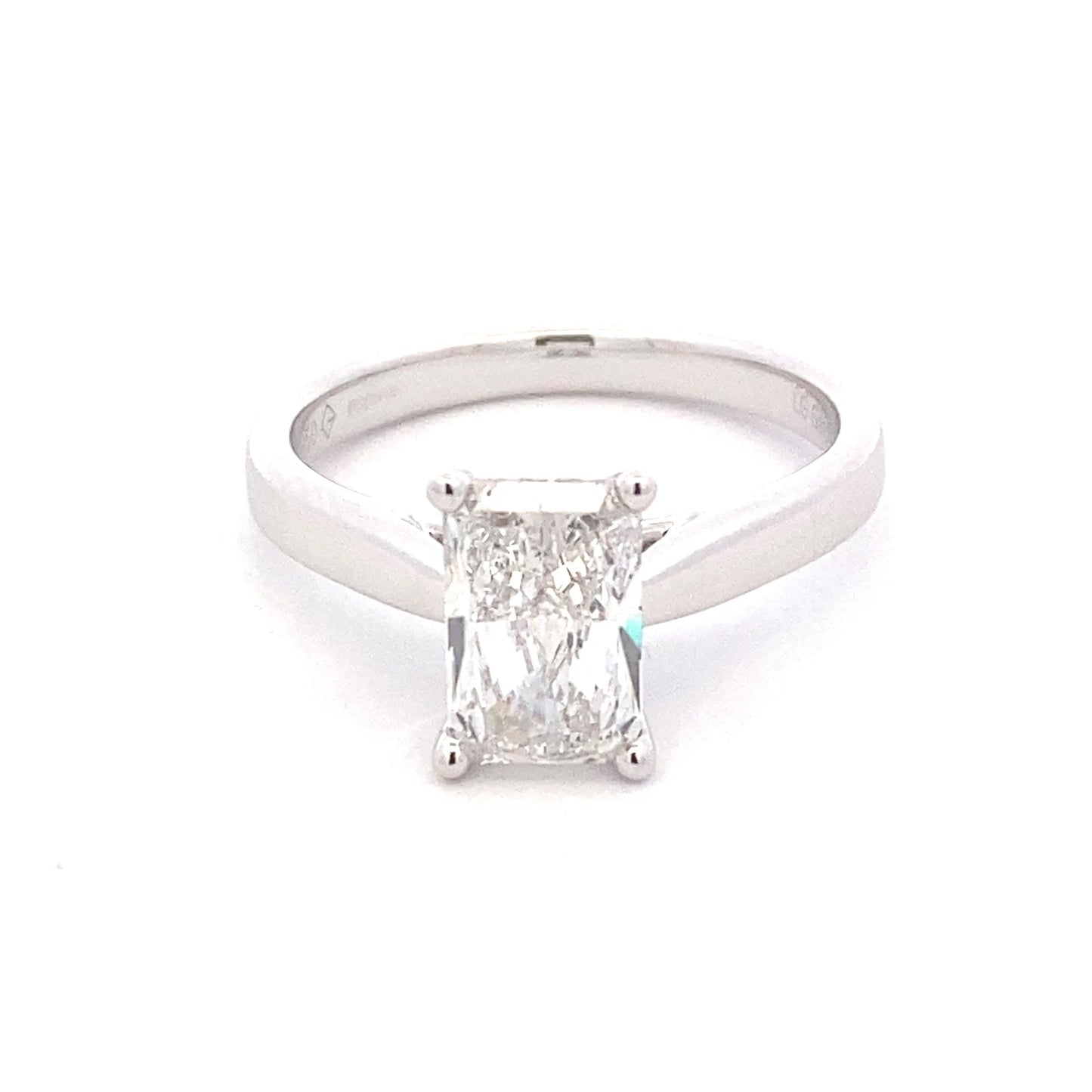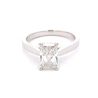 Experience the brilliance and elegance of our Lab Grown Radiant cut diamond solitaire ring. Made with a stunning 1.50ct diamond set in a platinum 4 claw setting, this ring is perfect for any occasion. Its solitaire design is also wedding band friendly, adding versatility to its timeless beauty.