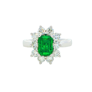 This exquisite cluster ring showcases a striking octagonal emerald as its centrepiece, masterfully set in platinum using a secure four-claw setting. The emerald is elegantly framed by ten round brilliant-cut diamonds arranged in a classic cluster design, creating a luminous halo that amplifies the stone's natural beauty. The platinum band ensures durability and a sophisticated finish, making this piece ideal for those seeking timeless elegance with contemporary styling.