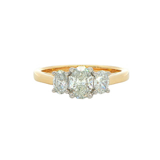 This stunning 3 stone ring features a 0.50ct oval shaped diamond set in a 4 claw platinum setting, with additional oval shaped diamonds on each side. Made with 18ct yellow gold, it totals 0.90cts and is wedding band friendly. Elevate any outfit with this elegant and timeless piece.