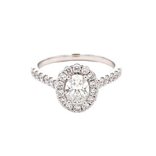 Expertly crafted in platinum, this Oval Shaped Diamond Halo Cluster Ring features a breath taking 0.60ct oval shaped diamond set in a 4 claw setting. Surrounded by a halo of round brilliant cut diamonds and diamond set shoulders, this ring boasts a total of 1.10cts. The perfect choice for those looking for a wedding band friendly ring.
