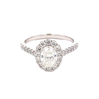 Elevate your style with our exquisite Oval Shaped Diamond Halo Cluster Ring. Crafted from platinum, the 0.90ct oval diamond is showcased in a 4 claw setting, accented by a sparkling halo of round brilliant cut diamonds and diamond set shoulders. With a total weight of 1.44cts, this ring is perfect for any occasion and wedding band friendly.