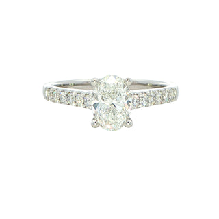 A timeless classic, this 1.25ct Oval Shaped Diamond Solitaire With Diamond Set Shoulders is set in four claw platinum setting for maximum sparkle. With 1.00ct oval diamond at the centre and round brilliant cut diamond shoulders 0.25cts in total, this ring is an unmistakable symbol of eternal love. Wedding band friendly, it completes your special day.