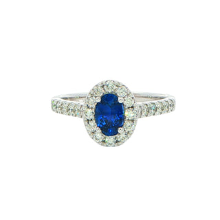 This exquisite sapphire ring showcases a stunning oval-cut stone secured in a refined four-claw platinum setting. The centrepiece is elegantly framed by a luminous halo of round brilliant-cut diamonds that amplify its radiance, whilst diamond-set shoulders extend the sparkle along the band. The combination of the deep, rich sapphire with the brilliant white diamonds creates a sophisticated contrast, making this piece a timeless choice for those seeking refined elegance and enduring beauty.