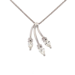 This Pear Cut Diamond Fancy Style Pendant showcases three sparkling pear cut diamonds totalling 0.82cts, set in elegant 18ct white gold. Elevate any outfit with this luxurious and unique piece, perfect for any occasion. Certified quality and expert craftsmanship make this pendant a valuable addition to your collection.