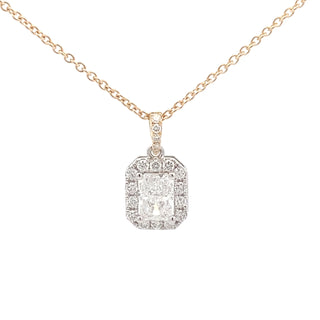 This exquisite pendant features a 0.90ct central radiant cut diamond surrounded by a round brilliant cut diamond halo, all set in platinum to enhance its brilliance and durability. Suspended from an 18ct yellow gold adjustable 18-inch chain, it offers both luxury and versatility. The D colour diamonds ensure exceptional clarity and sparkle, making this cluster-style pendant a refined choice for those seeking expert craftsmanship and timeless elegance.