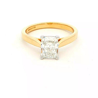 Crafted from 18ct yellow gold, this solitaire ring features a stunning 1.20ct radiant cut diamond securely held in a refined four-claw platinum setting. Its elegant design pairs seamlessly with wedding bands, making it an expert choice for a timeless engagement symbol.