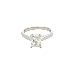 Exquisite 1.51ct radiant cut diamond solitaire ring crafted in premium platinum. The diamond is secured by a refined 4-claw setting that maximizes brilliance while ensuring stability. This elegant design sits perfectly alongside a wedding band, making it an ideal engagement ring with timeless appeal. The radiant cut offers exceptional fire and brilliance in a sophisticated rectangular shape.