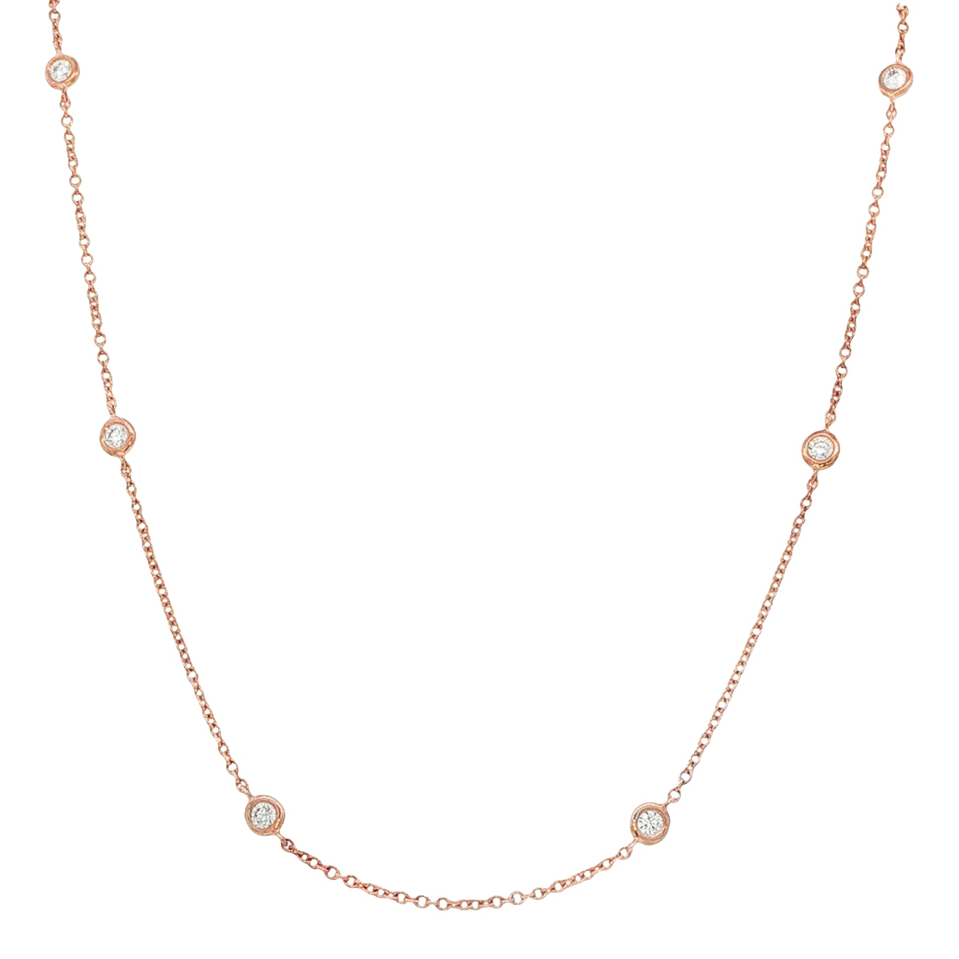 Expertly crafted in 9ct rose gold, this elegant "yard of diamonds" style necklet is set with 6 round brilliant cut diamonds. With a length of 18 inches, it can also be shortened to 16 inches for a customizable fit. Perfect for adding a touch of understated luxury to any outfit.
