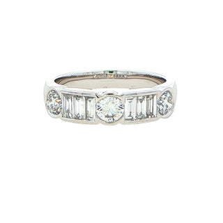 This expertly crafted eternity ring features nine exquisite diamonds, combining round brilliant and baguette cuts for a striking contrast. With a total carat weight of 1.12cts set in lustrous platinum, each stone reflects exceptional brilliance and precision. Designed for enduring elegance, this ring offers a sophisticated blend of classic and modern styles, perfect for marking timeless moments.
