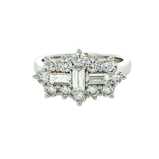 Crafted in platinum, this expert-designed cluster ring features three baguette cut diamonds elegantly secured in a precise four-claw setting. Surrounding them are twelve round brilliant cut diamonds, arranged in a distinctive boat-shaped cluster that enhances brilliance and depth. With a total carat weight of 1.53cts, this ring balances refined geometry and radiant sparkle, exemplifying sophisticated craftsmanship for discerning collectors.