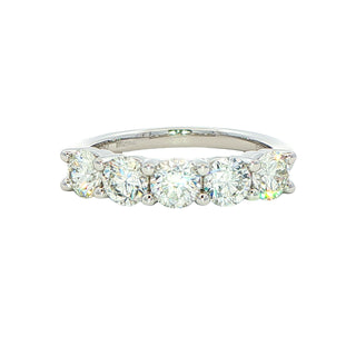 This expert-crafted eternity ring features five round brilliant cut diamonds totalling 1.60 carats, securely set in a classic four-claw platinum band. The design offers timeless elegance and exceptional brilliance, making it a refined symbol of enduring commitment.