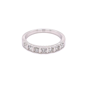 This elegant eternity ring features seven round brilliant cut diamonds, each meticulously selected for exceptional sparkle and clarity. Set in a sophisticated bar style configuration, the stones are secured in lustrous platinum, a precious metal prized for its durability and neutral brilliance that complements diamond fire. The 0.50-carat total weight delivers substantial presence whilst maintaining refined proportions. Ideal as a statement piece or meaningful gift, this ring exemplifies timeless design with contemporary styling. The bar setting offers a modern alternative to traditional designs, allowing light to enhance each diamond's natural radiance.