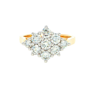 Crafted in 18ct yellow gold, this expert-designed cluster ring features nine round brilliant cut diamonds totalling 1.15 carats, expertly set in a durable platinum setting. The traditional cluster design enhances the ring’s brilliance and offers timeless sophistication, making it an elegant choice for those appreciating classic fine jewellery with enduring quality.