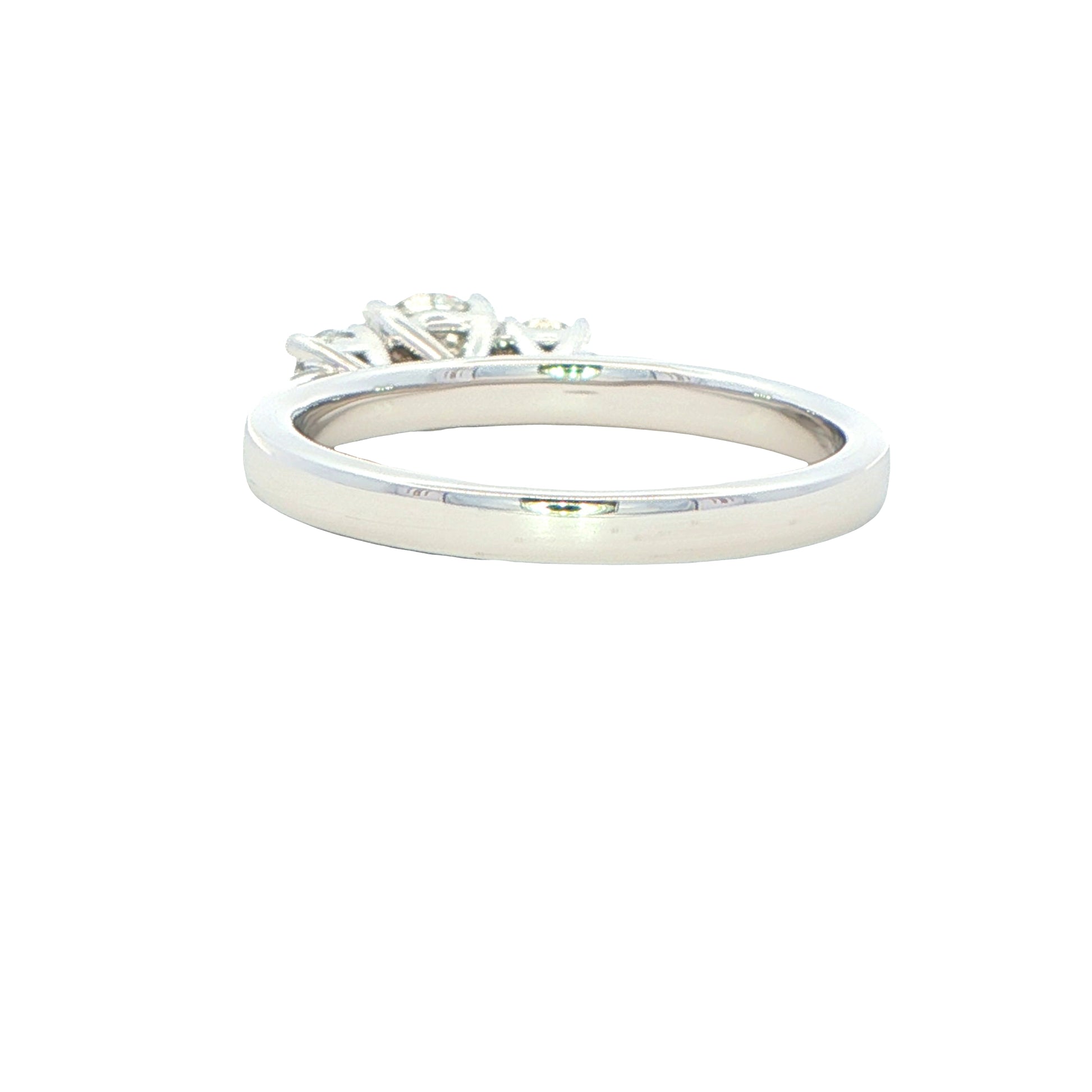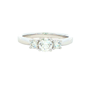 A timeless three-stone engagement ring crafted in platinum, featuring a stunning 0.40ct round brilliant cut diamond at its centre, flanked by complementary round diamonds on either side. The total diamond weight reaches 0.60cts, creating an elegant and balanced design. This classic configuration offers exceptional versatility, sitting beautifully alongside a wedding band for a coordinated bridal look. The brilliant cut maximises light performance and sparkle, whilst the platinum setting ensures durability and a lustrous white finish that complements any diamond perfectly.