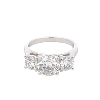 Expertly crafted with a stunning 1.57ct round brilliant cut diamond, this 3 stone ring also features two 0.50ct diamonds set in platinum. The wedding band-friendly design adds versatility to this already impressive piece. Elevate your style with this exquisite ring that boasts a total of 2.57cts.