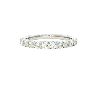 This elegant wedding band features 0.50 carats of expertly selected diamonds, each cut to maximise brilliance and fire. The 11 diamonds are securely set in a bar configuration, creating a contemporary design that complements both solitaire engagement rings and worn alone. The round brilliant cut remains the most popular diamond shape, renowned for its superior light performance and timeless appeal. Crafted with precision, this band offers a sophisticated balance of sparkle and understated elegance, making it an ideal choice for those seeking a refined everyday piece.
