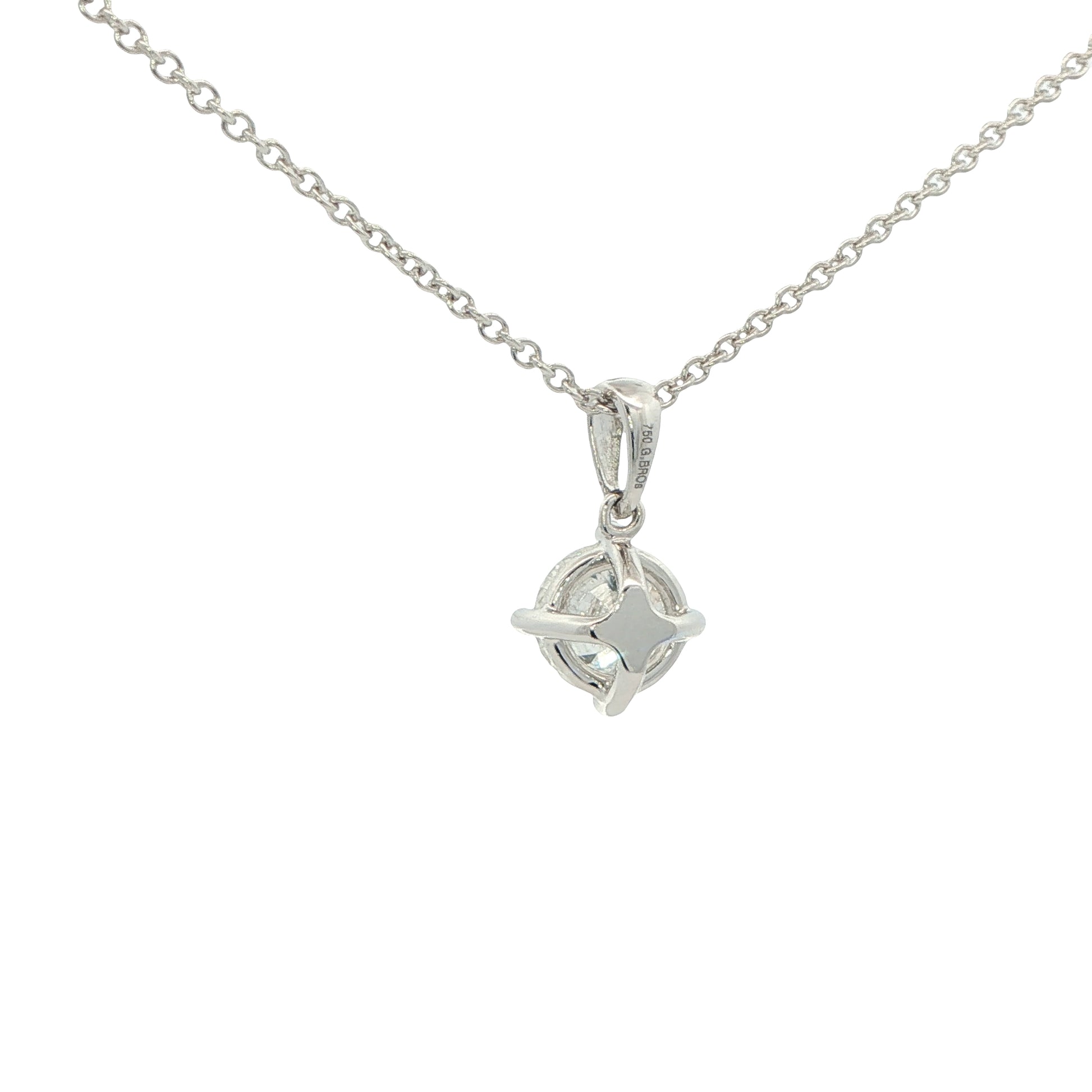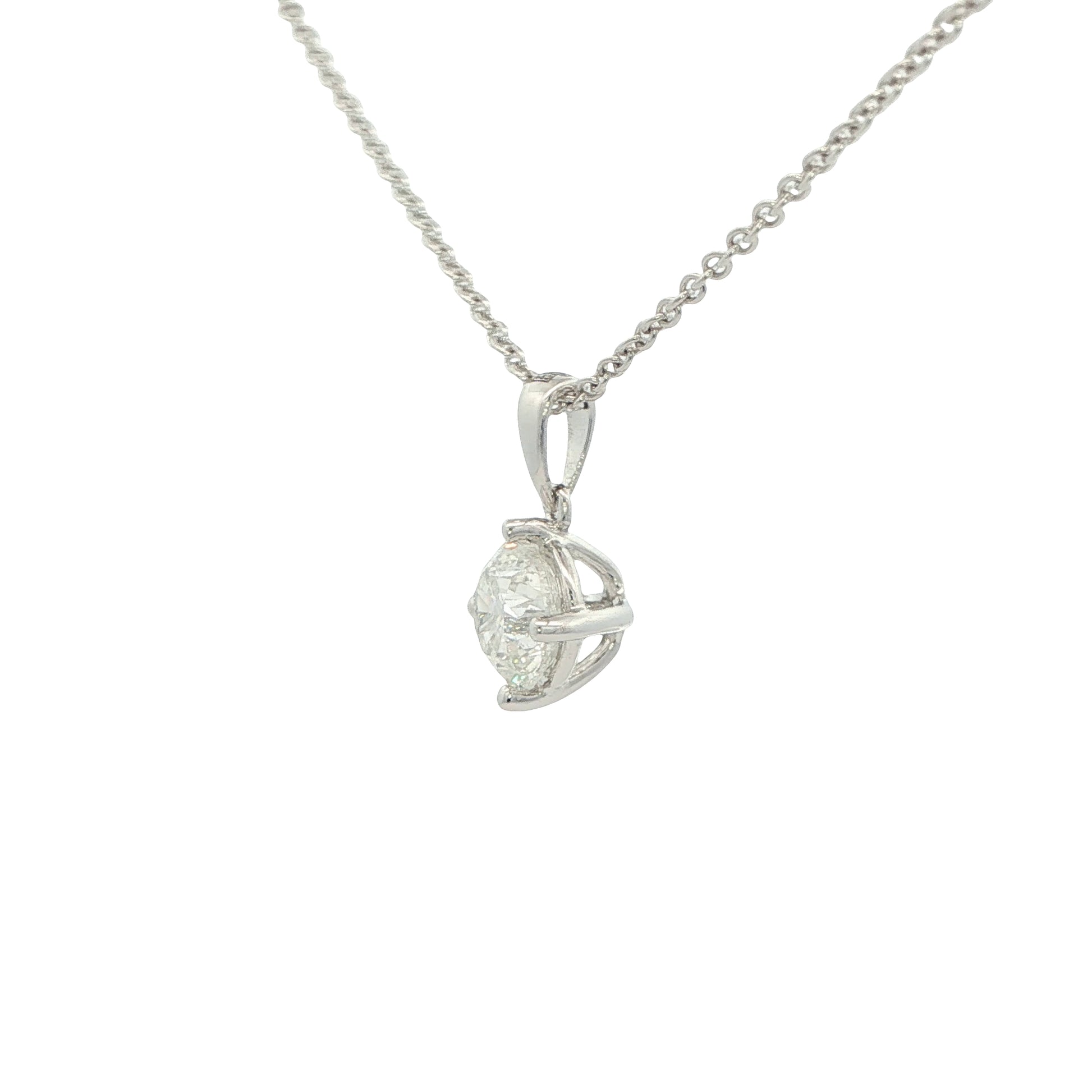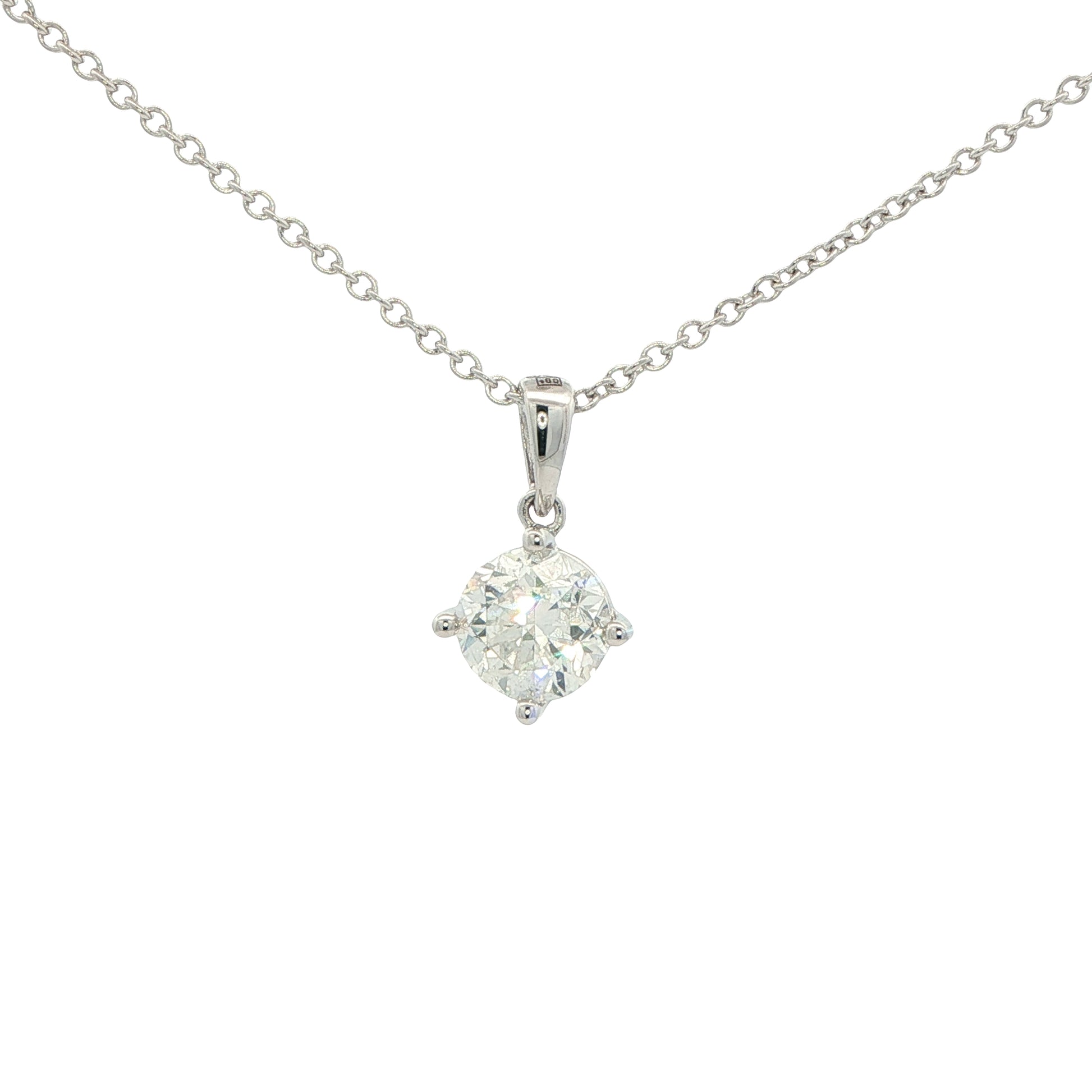 This magnificent Round Brilliant Cut Diamond Solitaire Pendant is set in an 18ct white gold four claw setting. Featuring a 1.50ct round brilliant cut diamond, it's sure to dazzle. The adjustable length chain ensures a perfect fit.
