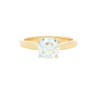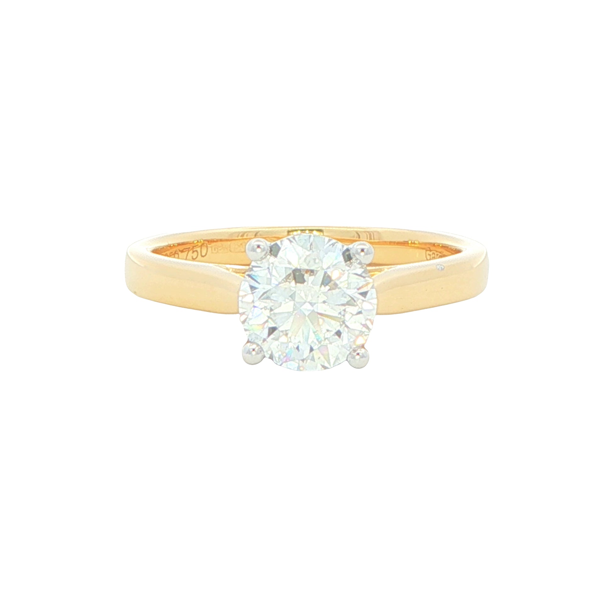 A timeless solitaire showcasing a stunning 1.20 carat round brilliant cut diamond, expertly set in secure four-claw platinum settings. The 18ct yellow gold band provides warmth and elegance, whilst the elevated platinum setting ensures your diamond takes centre stage. Designed with a refined profile that pairs seamlessly with wedding bands, this ring combines classic sophistication with practical versatility.