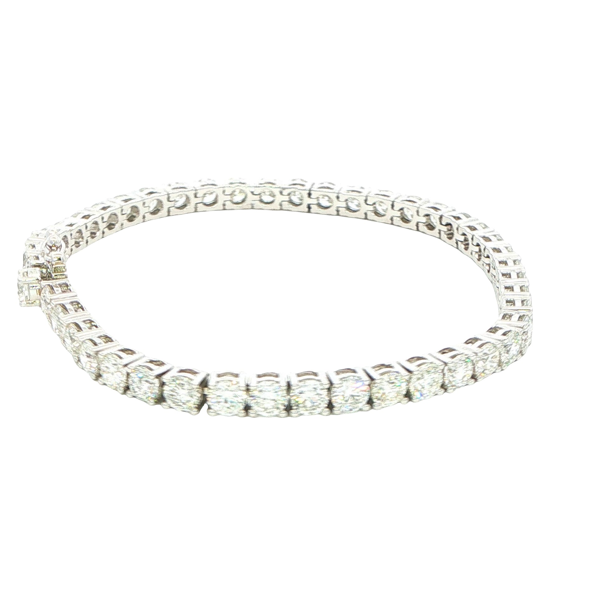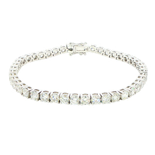 This exquisite tennis bracelet showcases 10.94 carats of round brilliant cut diamonds, each stone expertly set in a secure four-claw setting that maximises light return and brilliance. Crafted from 18ct white gold, the classic design offers timeless elegance with contemporary sophistication. The continuous line of precisely matched diamonds creates a seamless sparkle around the wrist, making this piece equally suited to formal occasions or refined everyday wear. A statement of refined taste and enduring luxury.