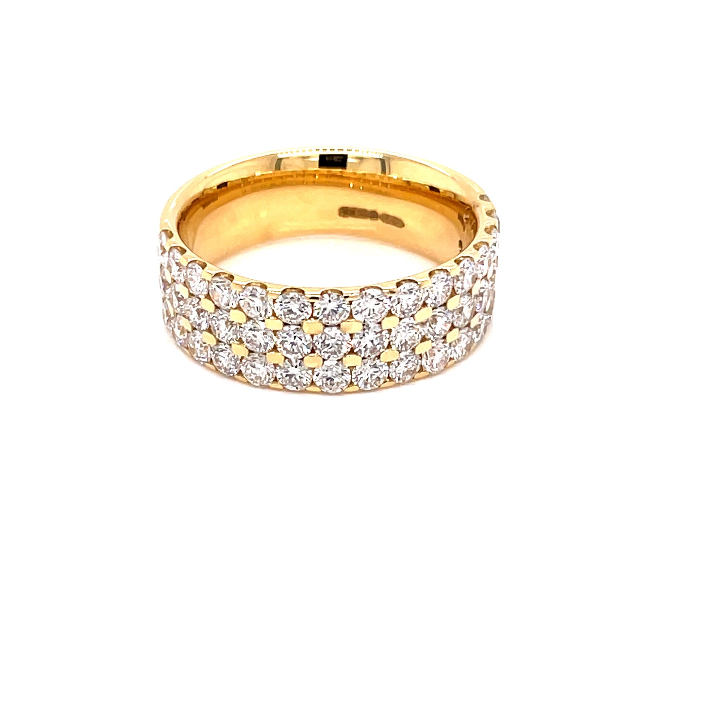 18ct yellow gold, round brilliant cut diamonds set in a triple row eternity dress style ring.