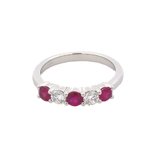 This expertly designed 5-stone ring features rich rubies and round brilliant cut diamonds, all set in durable platinum. The platinum setting enhances the stones' brilliance while providing lasting strength and a refined finish. Ideal for those who appreciate timeless elegance and superior craftsmanship, this ring offers a striking balance of vibrant colour and classic sparkle.