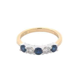 This exquisite ring features a sophisticated 18ct yellow gold band paired with a durable platinum setting, showcasing three vibrant sapphires alongside two brilliant round-cut diamonds. Expertly crafted, it balances rich colour with sparkling clarity, making it a timeless piece for discerning collectors.