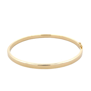 Discover timeless elegance with our Yellow Gold Bangle. Crafted from high quality 9ct yellow gold, this 4mm solid bangle boasts a flat profile with rounded edges for a sleek and modern look. Elevate any outfit with this versatile and durable accessory.