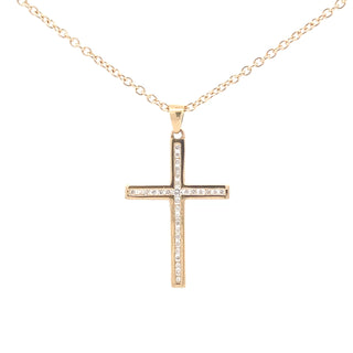 Elevate your style with this elegant Yellow Gold Cross Pendant. Crafted with 18ct yellow gold, it features a stunning 20mm x 15mm cross adorned with round brilliant cut diamonds in a channel setting. Complete with a 9ct yellow gold chain that can be adjusted to your desired length. A timeless piece for any collection.