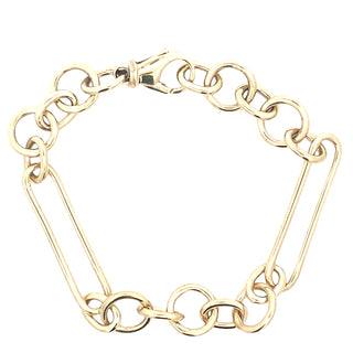 This 19cm bracelet features a sophisticated combination of large solid oblong and round links crafted from 9ct yellow gold. Its elegant design offers a timeless accessory that complements both casual and formal attire, providing durability and classic style for everyday wear.
