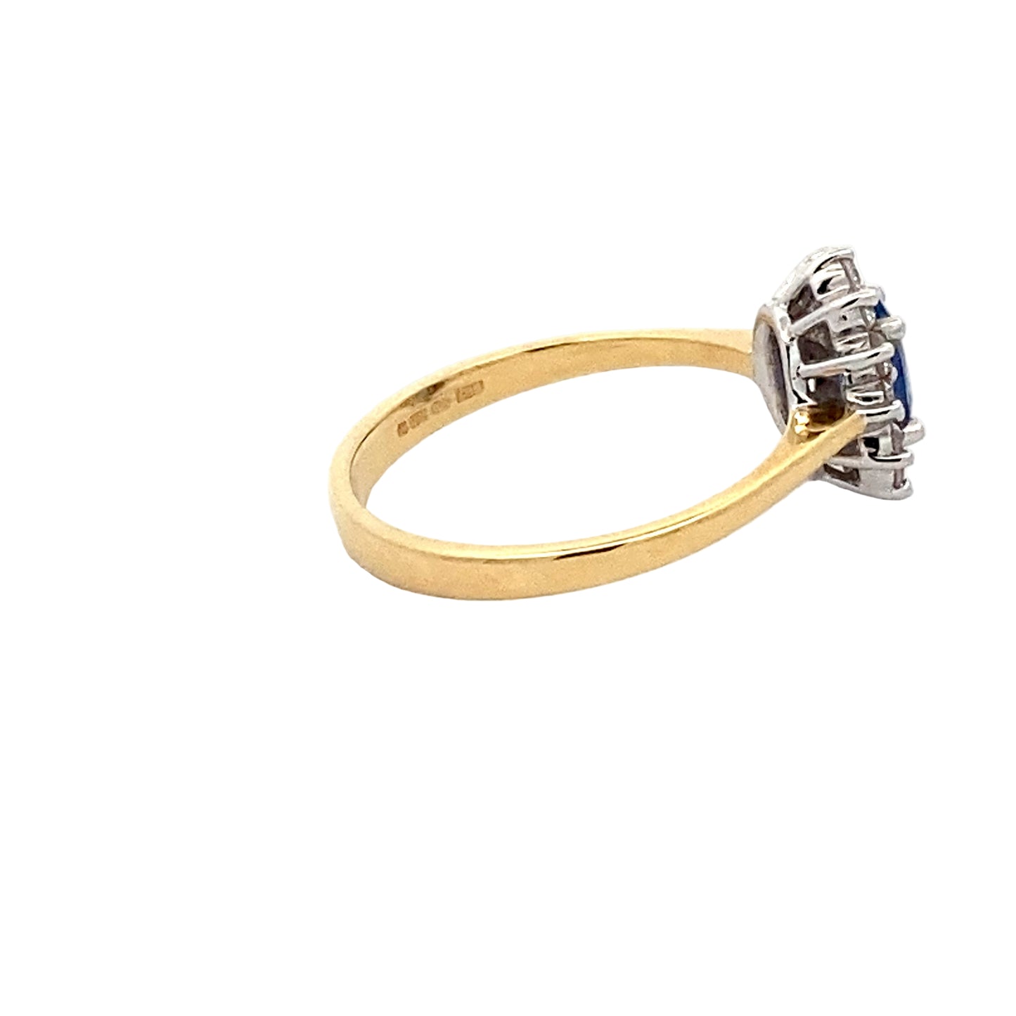 Expertly crafted with a 4 claw white gold setting, this 18ct yellow gold ring showcases a stunning oval-shaped sapphire, surrounded by 12 sparkling round brilliant cut diamonds in a cluster style. Elevate your style and make a statement with this elegant and timeless piece.