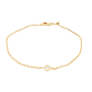 This elegant 9ct yellow gold bracelet features a single 0.10ct round brilliant cut diamond secured in a sophisticated rub-over setting. The timeless design combines the warmth of yellow gold with the enduring sparkle of a quality diamond, creating a refined piece suitable for both everyday wear and special occasions. The secure rub-over setting protects the stone whilst allowing light to enhance its brilliance.
