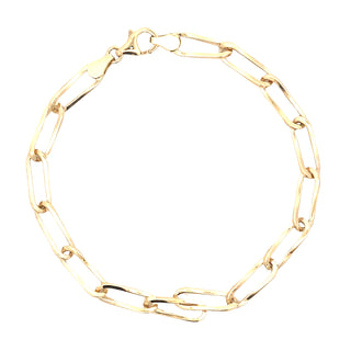 This 9ct yellow gold bracelet features a sophisticated twisted oblong link design, measuring 19cm in length. Its elegant craftsmanship offers a refined accessory that complements both casual and formal attire, providing lasting durability and timeless style. Ideal for those seeking a distinctive yet classic piece of jewellery.